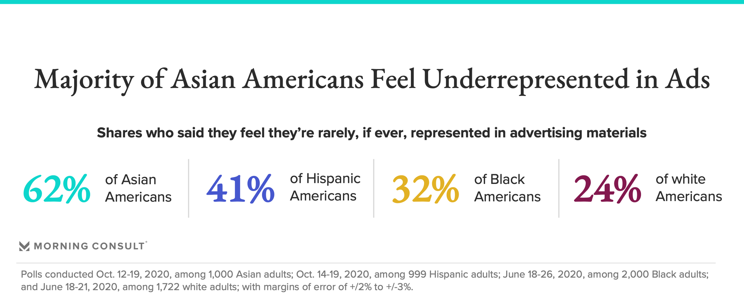 Ever since the resurgence of the Black Lives Matter movement this summer, many brands have taken steps to feature more Black consumers in their marketing efforts. But new polling from Morning Consult shows that other major groups of U.S. consumers — Asian Americans and Hispanic Americans — feel even more underrepresented in advertising than Black and white Americans.